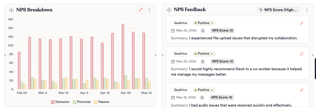 You can answer questions like "What are the top complaints from enterprise customers this month?" or "Show me a chart of NPS detractor drivers" directly from your workspace.